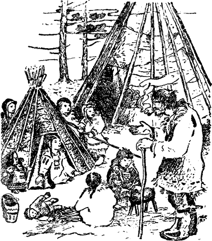 Залаяли собаки, отец Топки вышел из чума. По склону горы шагали олени, из далекой тайги приехало несколько семей. Свои остроконечные чумы они поставили рядом с чумом Топки Большого.