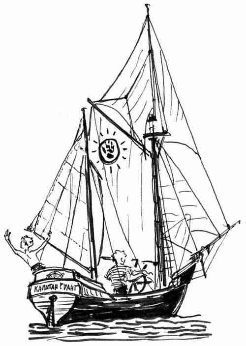 «Капитан Грант». Гафельный кеч, то есть двухмачтовое судно с длинной грот-мачтой и более короткой бизань-мачтой. Был построен на основе обычной шестивесельной шлюпки и стилизован под старинный парусник. Экипаж – взрослый энтузиаст парусного дела Геннадий Кошкарёв и группа ребят во главе с тринадцатилетним рулевым Кириллом Векшиным, чьи приключения легли в основу повести. (Колыбельная для брата).