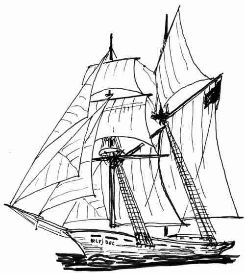 «Милый Дюк». Марсельная шхуна шкипера Джорджа Седерпауэла (он же Жора Сидоропуло), вероломно сожженная сыщиком и шпионом Шпицназе по прозвищу Нус-Прошус во время ремонта на берегу острова Нуканука. (Портфель капитана Румба).