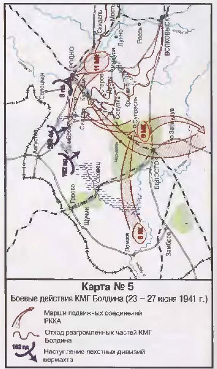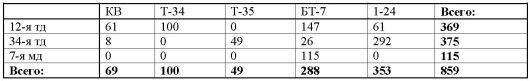 Как видим, корпус состоял из двух неравных частей: «старой» кадровой дивизии (12-й тд), укомплектованной новейшими танками и скоростными БТ-7, и новой (34-я тд) танковой дивизии формирования весны 1941 г., вооружённой главным образом лёгкими и, безусловно, уже устаревшими Т-26. Примечательной особенностью 34-й тд было наличие на её вооружении совершенно экзотической техники — пятибашенных тяжёлых танков Т-35. По составу вооружения (короткоствольная 76-мм пушка, две 45-мм танковые пушки 20К и две пулемётные башни) один Т-35 равнялся группе из пяти немецких танков (один Pz-IV, два Pz-III и два Pz-I), а два батальона тяжёлых танков (всего 48 исправных Т-35) в целом по числу танковых орудий превосходили любую из танковых дивизий 1-й Танковой группы вермахта.