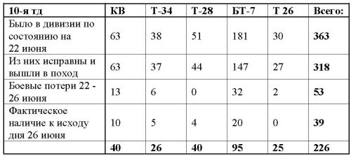Итак, самая мощная в 15-м МК (и одна из лучших по укомплектованности и подготовке личного состава во всей Красной Армии) 10-я тд за пять дней превратилась в изрядно потрёпанный танковый батальон. От 318 исправных по состоянию на 22 июня танков к исходу дня 26 июня в строю осталось всего 39. Потери «неизвестного происхождения» составили 226 танков. За пять дней. Даже если предположить, что в докладе командира дивизии и упущены какие-то боевые потери в ходе эпизодических стычек с немецкими пехотными частями, то эта неточность никак не объясняет расхождение между числом боевых (53 танка) и общих (279 танков) потерь. Особенно впечатляют динамика и структура потерь трёхбашенных Т-28, которые тихо исчезают, так и не успев, вероятно, сделать ни одного выстрела по противнику. Если верить отчёту, 48-тонные КВ с их 75-мм бронёй ничуть не превосходят по боевой живучести лёгкие БТ-7 и Т-26 с противопульным бронированием. Самое же удивительное — ни в докладе ВРИО командира дивизии, ни в докладе ВРИО командира корпуса эти вопиющие факты даже никак не комментируются!