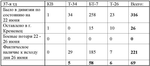 В 37-й танковой дивизии пока что дела обстоят значительно лучше. 221 танк (из 316) готов вступить в бой. Ещё 26 ждут своего часа на месте постоянной дислокации дивизии в г. Кременец. Три четверги от общего числа «безнадёжно устаревших» БТ-7 выдержали многодневные бестолковые метания по лесным дорогам и, судя по отчёту командира дивизии, пока ещё исправны.