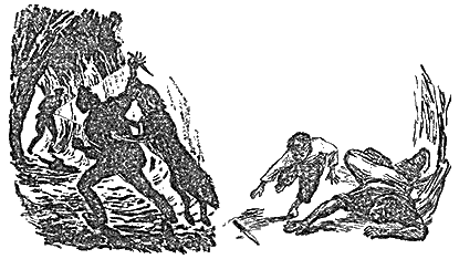 В пещере было двое людей. Один лежал на земле, другой, прижавшись к стене, размахивал ножом. Они, очевидно, только что проснулись. Нападение застало их врасплох.